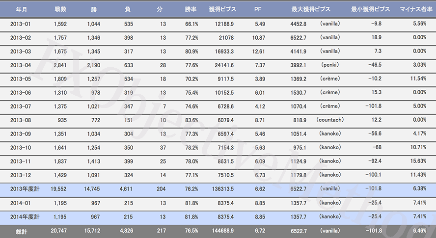 内訳不明データが発生するのは、希にメンバーが合計だけをアップしている日記があるためです。これらが十数件混ざっていましたが、SNS内で再度呼びかけ不明分を修正しています。そんなに問題にならない程度なのですが、PF値を出すときに獲得ピプスとの誤差が出続けるのが気持ち悪く、今後のことを考えて精査しました。マイナス分を除外ということではないのでご理解いただければと思います。