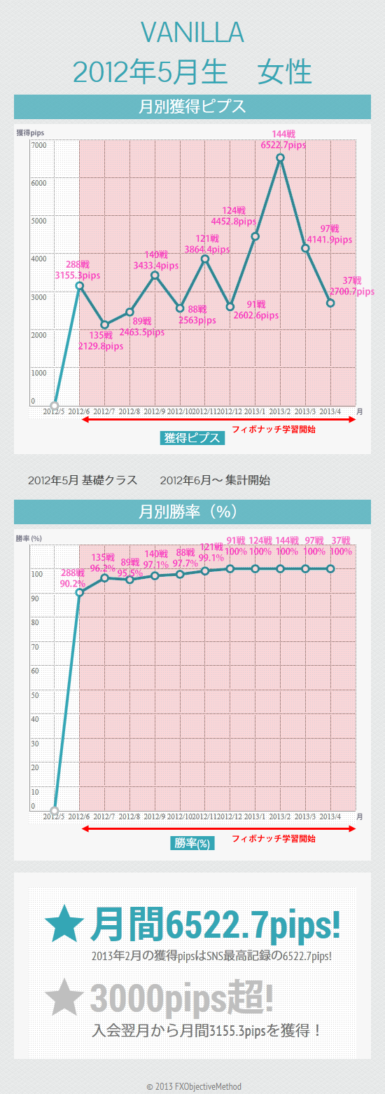 ユーロ円 1354戦 1310勝 38敗 8分 勝率 97.8% 総獲得ピプス 38030.1ピプス (2012/06~2013/04 11ヶ月間)
