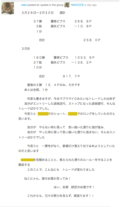 3月新人Nekoにゃん集計 Posted on 2012年4月1日 by rannam 3月からメソッドを開始したNekoさんの月の集計 日記よりキャプチャ 無料ブログでも、日々のスキャルピング成績などアップしています!! FXRCIメソッド(旧名FXOM)